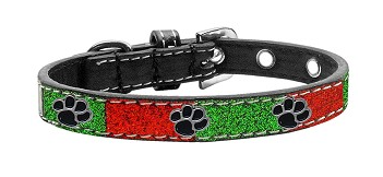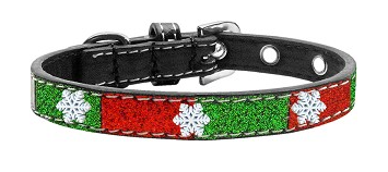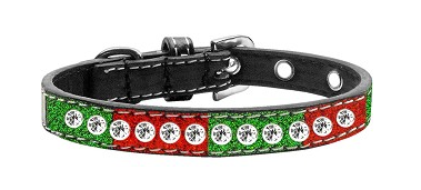 Glittery faux leather in a festive holiday combination of colors. Offered in collars that are adorned with stunning crystal bones and enhanced with nickel-plated hardware.